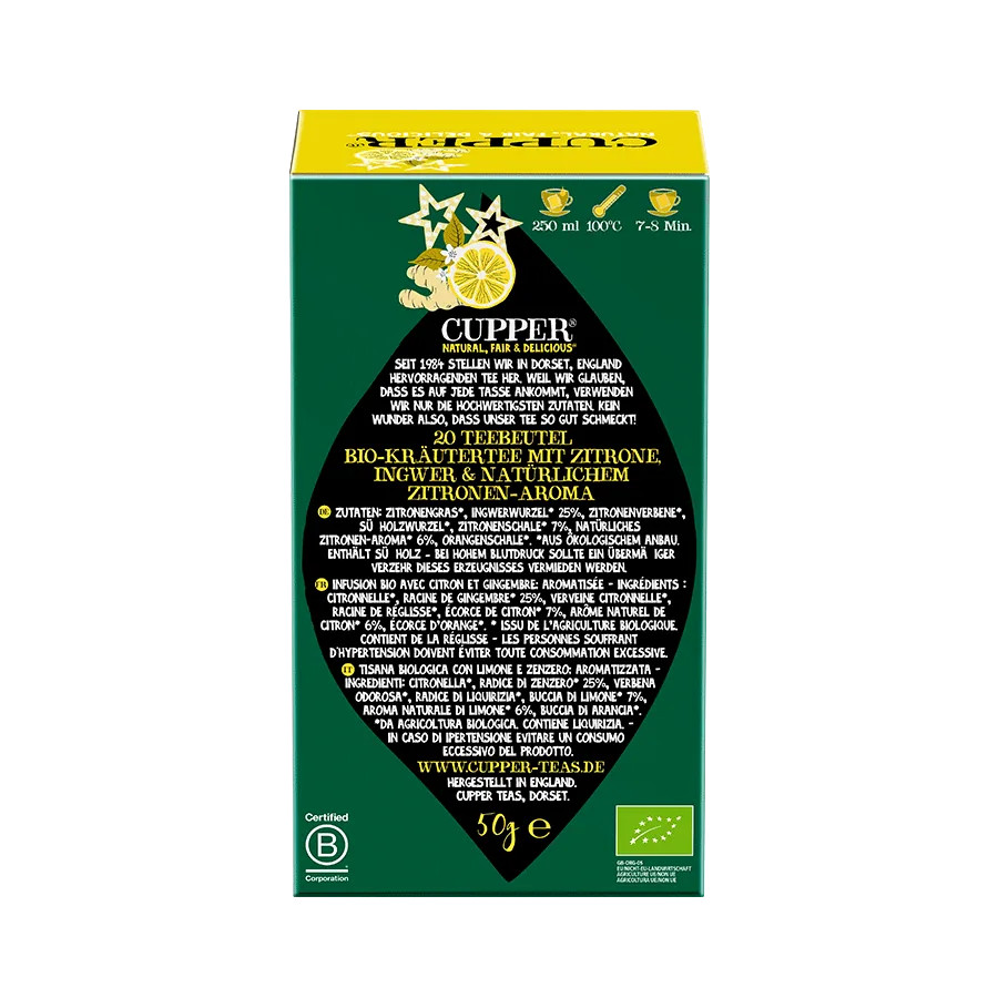 A CUPPER Citrom & Gyömbér bio tea a friss citrom üdítő lendületét és a gyömbér pikáns erejét ötvözi egy igazán különleges gyógynövényteában. A citromfű, a citromhéj és a citromverbéna könnyed, citrusos jegyei találkoznak a gyömbér melegítő karakterével, amely így egyszerre frissít és melenget.