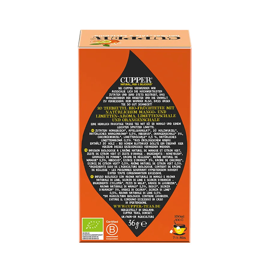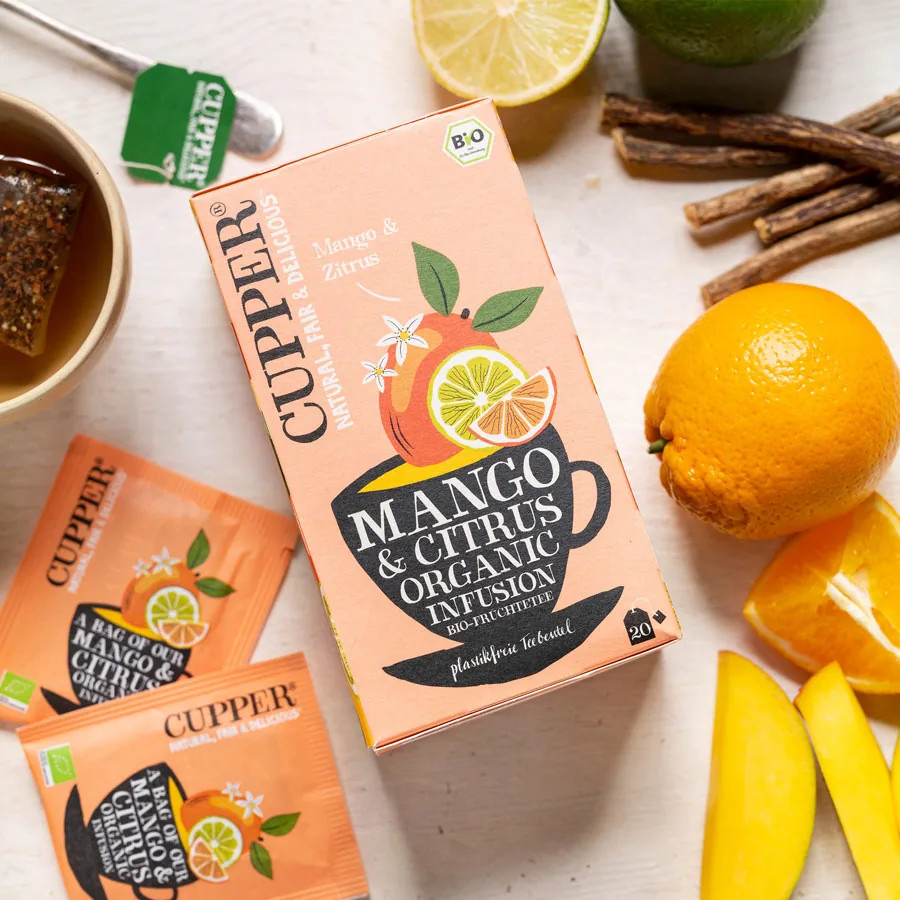 A CUPPER Mango & Citrus bio gyümölcstea a trópusi mangó édes ízét ötvözi a lime és a narancs frissítő citrusos karakterével. Egy igazán gyümölcsös, üdítő tea, amely kellemesen édes-savanykás ízvilágával forrón és jeges teaként is tökéletes élményt nyújt.