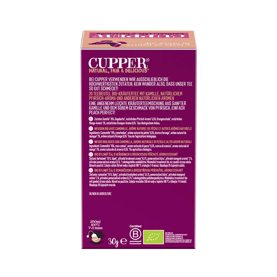A CUPPER My Happy Place bio tea egy könnyed, harmonikus keverék, amely a kamilla gyengéd nyugtató hatását ötvözi a barack édes, gyümölcsös ízével. A csipkebogyó, a narancshéj és a természetes mangó- és narancsaroma finom rétegei teszik teljessé ezt a csészében is „boldogságot hozó” teát. Egyszerűen peach perfect!
