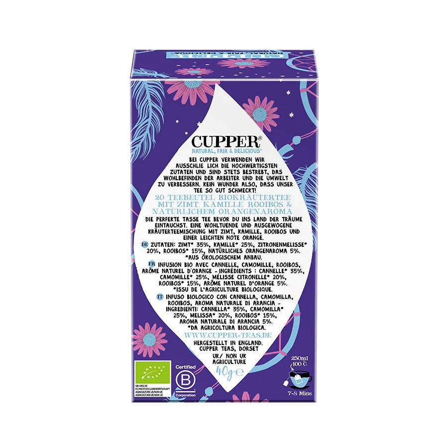 A CUPPER Nightea Night bio gyógynövény tea a tökéletes társ, mielőtt álomra hajtjuk a fejünket. Ez a kellemes, kiegyensúlyozott keverék a fahéj melegítő fűszerességét, a kamilla és a citromfű nyugtató hatását, valamint a rooibos lágy karakterét ötvözi, finom narancsos jegyekkel kiegészítve. Egy igazán pihentető, esti csésze tea, amely segít ellazulni a nap végén.