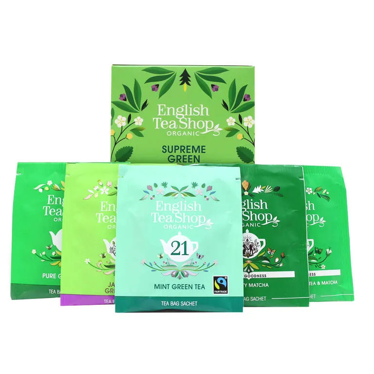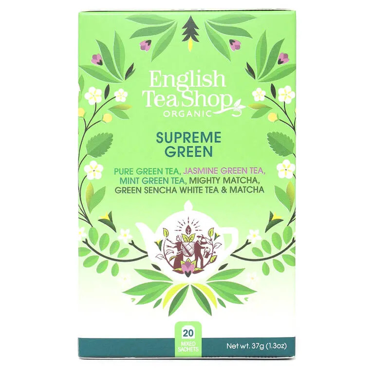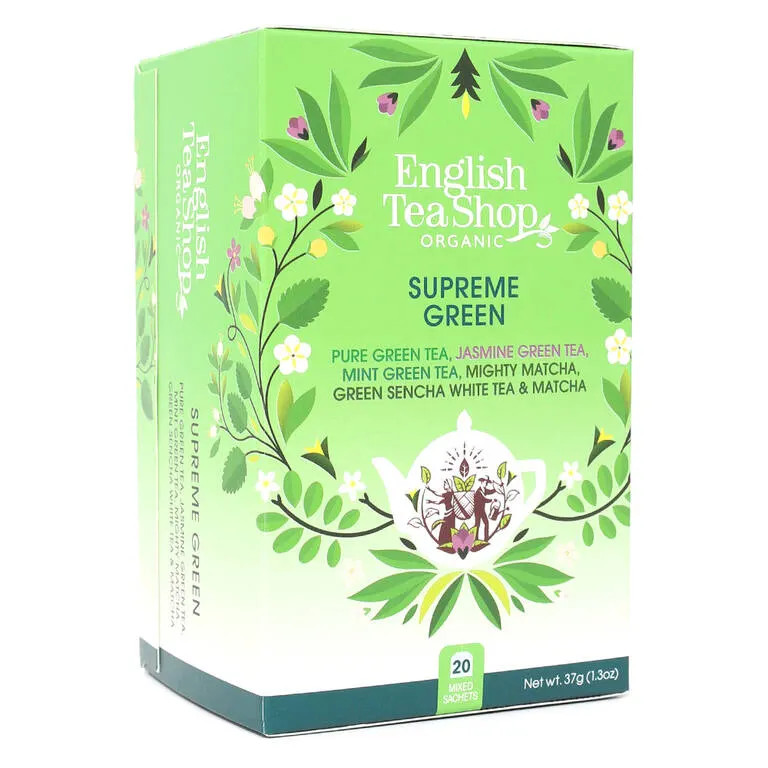 Az English Tea Shop Supreme Green – A legnemesebb zöld teák – bio teaválogatás a frissesség, a minőség és a változatosság tökéletes kombinációja. Egy doboz, amely minden zöldtea-rajongónak felejthetetlen élményt nyújt.