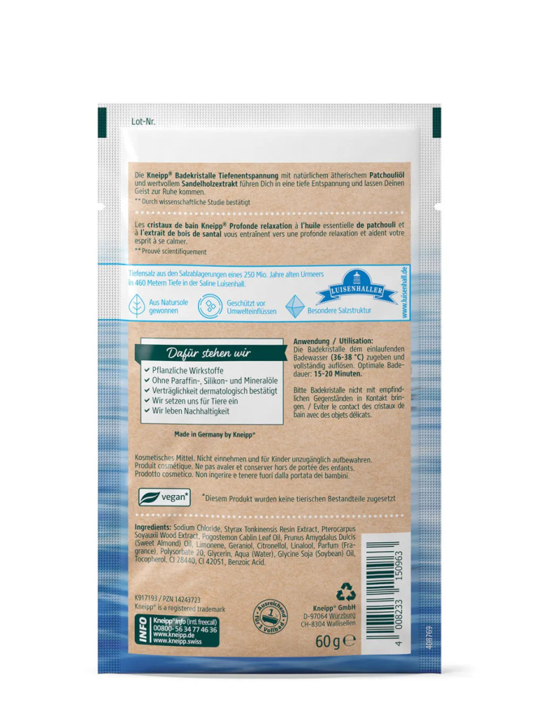 A Kneipp Mélyrelaxáló fürdőkristály természetes pacsuli olajat és szantálfa kivonatot tartalmaz, amelyek harmonizáló, nyugtató hatásukkal segítik a test és a lélek regenerálódását. A természetes termálsó alap támogatja a bőr megújulását, miközben a meleg, földes illat mély pihenést biztosít.