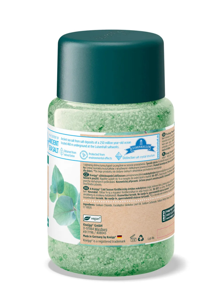 A Kneipp Szabad légutak fürdőkristály természetes eukaliptusz illóolajat tartalmaz, amely segíti a légutak tisztulását, felfrissíti a testet és átmelegíti a szervezetet. A meleg, illatos fürdő segíti a szabadabb légzést és hozzájárul a regenerációhoz, különösen a hideg évszakokban.