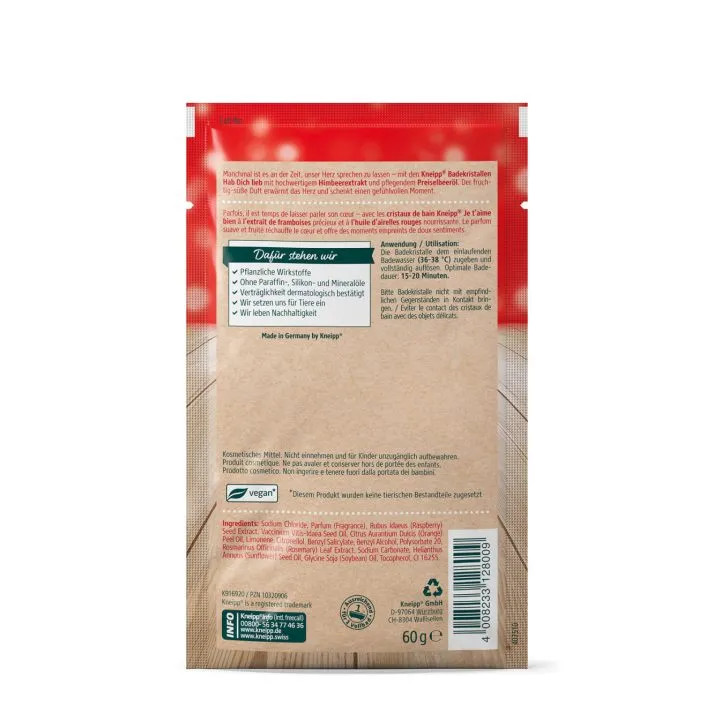 Néha eljön az ideje, hogy a szavak helyett a szívünk beszéljen. A Kneipp Szeretlek fürdőkristály málnakivonattal és tőzegáfonya olajjal készült, hogy egy édesen gyümölcsös, szeretettel teli fürdőélményt nyújtson. Kiváló minőségű, természetes termálsó alapjával segíti a bőr regenerálódását, miközben a finom illat megmelengeti a lelket.