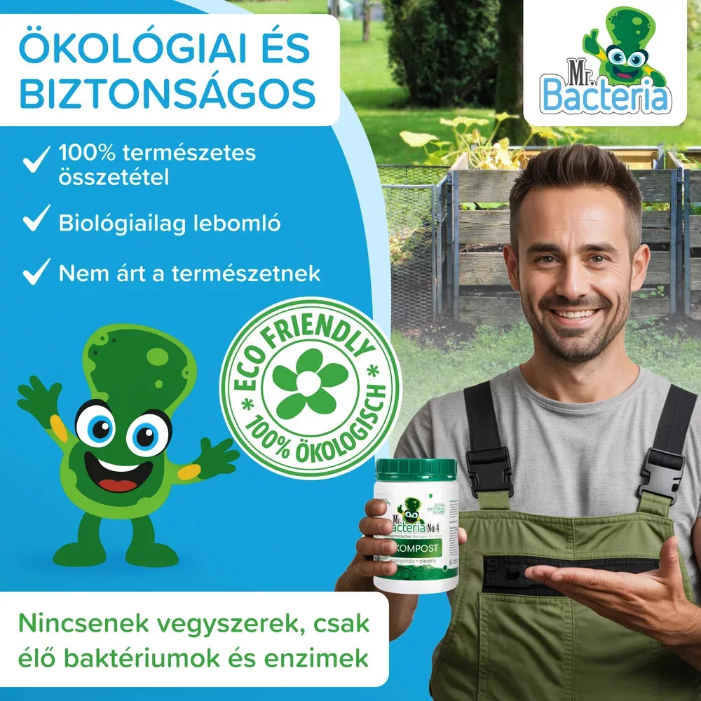A Mr. Bacteria No.4 egy 100%-ban természetes, biológiai összetevőket tartalmazó komposztgyorsító készítmény, amely segíti a háztartási és kerti hulladék lebontását, ezzel gyorsítva a komposztálási folyamatot.