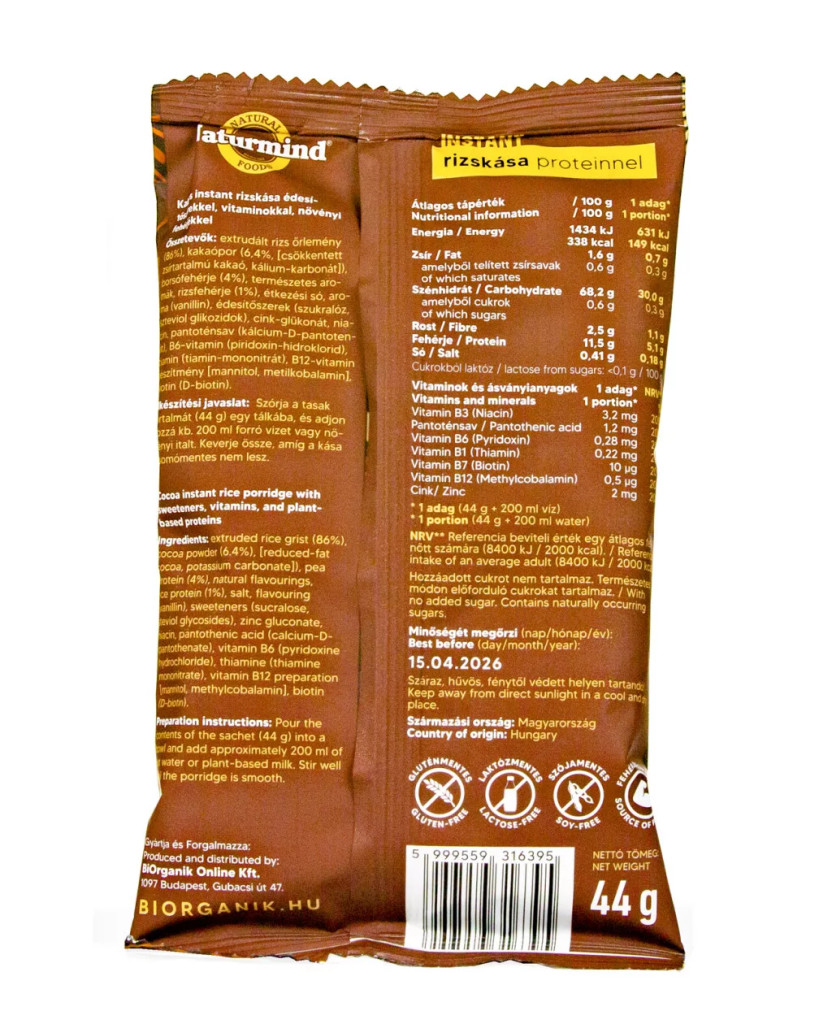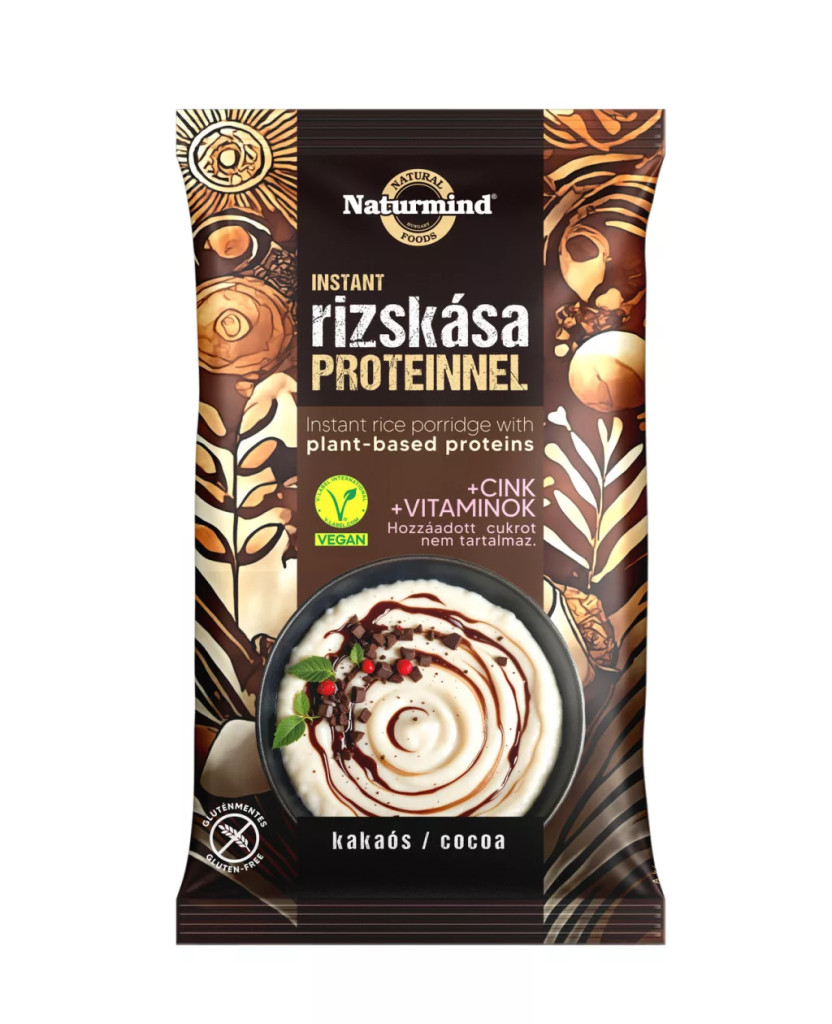 A rizs alap könnyű, gluténmentes megoldást kínál, amelyet kakaóval gazdagítottak az intenzív ízhatás érdekében, míg a hozzáadott fehérje hozzájárul az étkezés teljesebbé tételéhez.