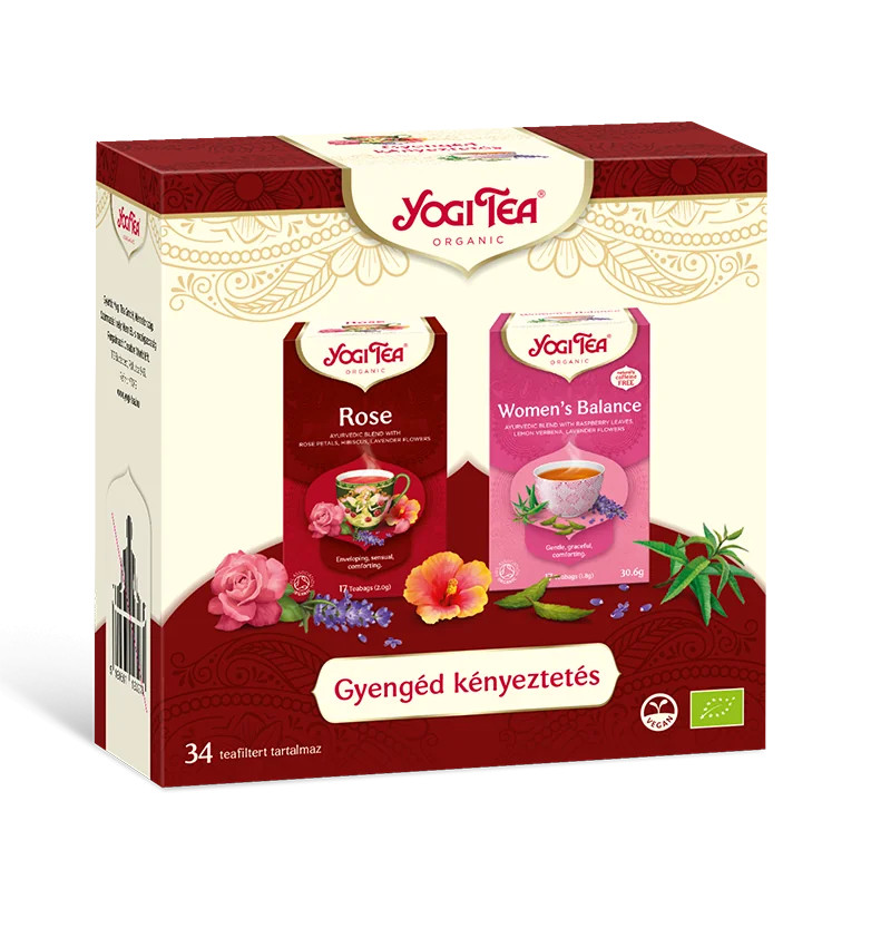 A Yogi Tea "Gyengéd kényeztetés" bio ajándékcsomag két különleges, ajurvédikus teakeveréket tartalmaz, melyek harmonizálnak a testtel és lélekkel egyaránt. A Rose és Women's Balance teák segítenek megőrizni a nőiesség egyensúlyát, miközben kényeztetik az érzékeket.