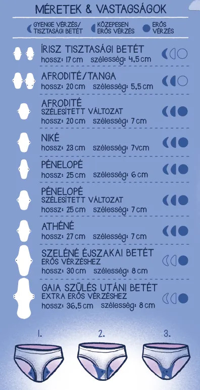 Minden mosható betétnek van egy patentolt szélessége és egy hossza.